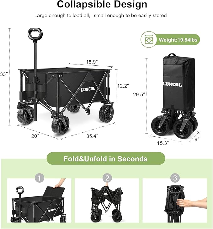 - Compact&Collapsible Wagon: No assembly required. Innovative design that makes it quick and simple to set up and fold down it in seconds, with the handle on the cover, you can move it smoothly and take it to anywhere easily. Folded size (L x W x H): 9 x 15.3 x 29.5inches; Weight: 19.84Lbs; It is perfect fit in closet, garage or in the trunk of any standard car while only minimum space is needed