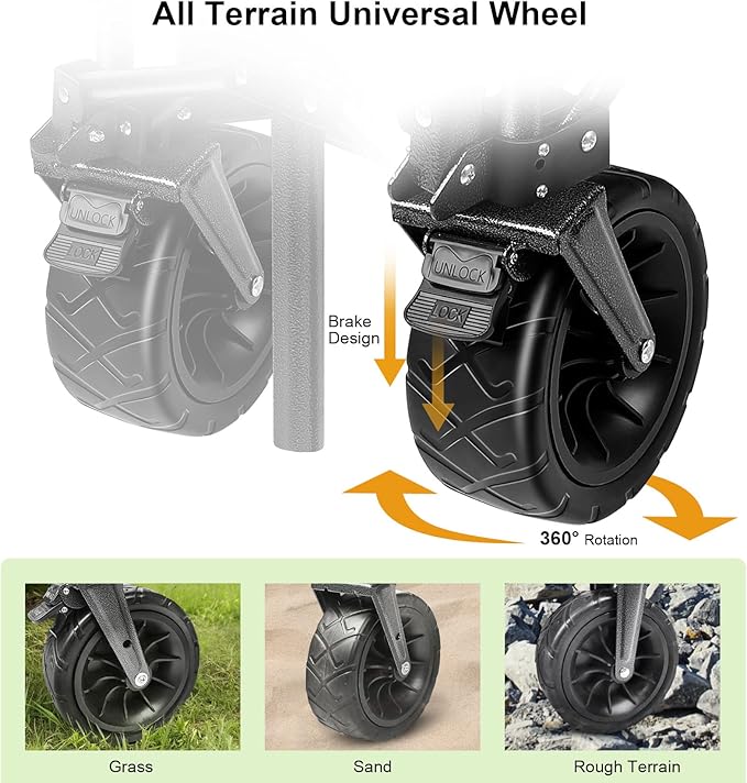 - Smooth Transport with All-terrain Wheels:There are 4 big wheels give you a smooth pull and easy transport this portable cart on sand, gravel, grass, or virtually anywhere. Designed with 360°rotating front wheels that make pushing and pulling of wagon easy and convenient