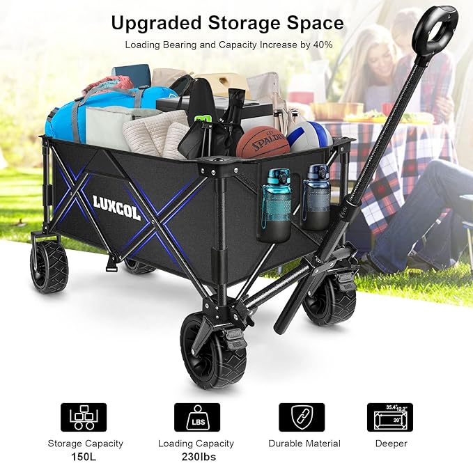 LUXCOL Collapsible Folding Wagon, Heavy Duty Utility Beach Wagon Cart for Sand with Big Wheels, Adjustable Handle&Drink Holders for Shopping, Camping,Garden and Outdoor