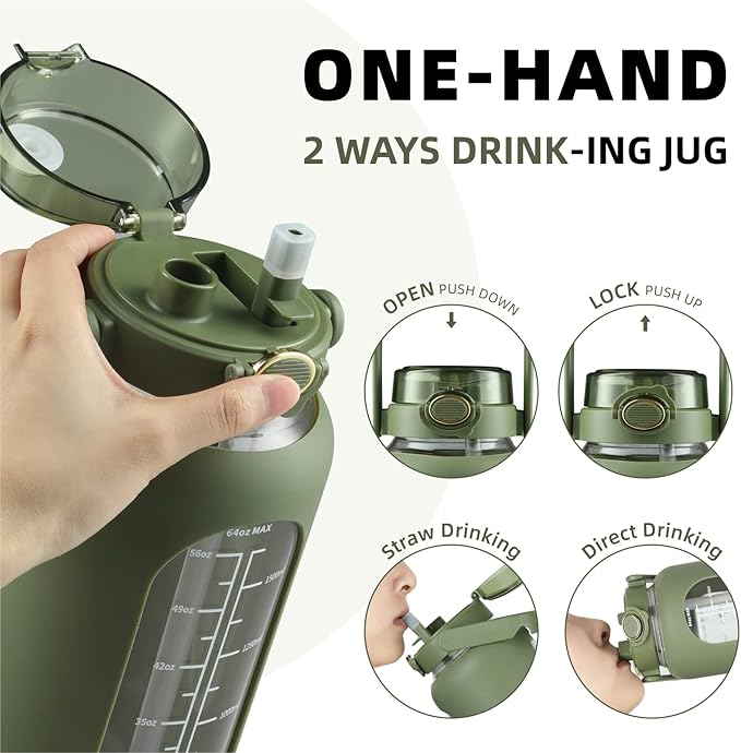 - Glass Water Bottle with Handle Lid : This half gallon water bottle featured with latest pop up lid with silicone O-ring, secure lock & dust cover, the large glass bottle has two ways to drink water There's both a silicone straw and a hole that can be drank from directly , which is very convenient and fast