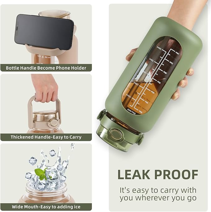 - Glass Water Bottle 64oz :The water jug with straw is designed with high-quality silicone sleeve to protect water bottle from slight bumps. In order to make the half-gallon(2 liters) big gym motivational water bottle easy to carry we have equipped it with handle. Wide-mouth opening make it easy to fill with ice cubes & fruits and daily clean