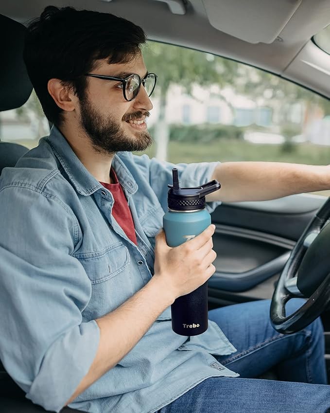 - 【First-Class Material and Treatment】: The 32 oz insulated water bottle is made of 18/8 food-grade stainless steel that's BPA-free and non-toxic. Powder coating offers a steady grip without slipping from sweaty palms, which makes driving safe.