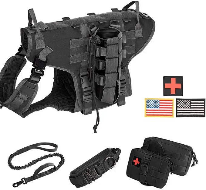 - What you will get: 1 military dog vest harness + 2 backpack pouches + 1 water bottle pouches +1 tactical training dog collar with quick release buckle + 1 adjustable bungee training dog leash + 1 us flag patches