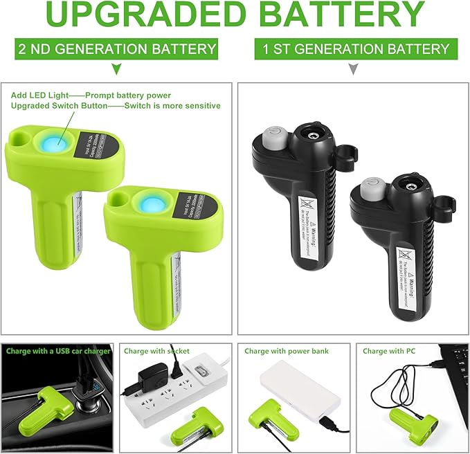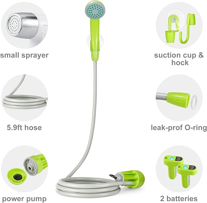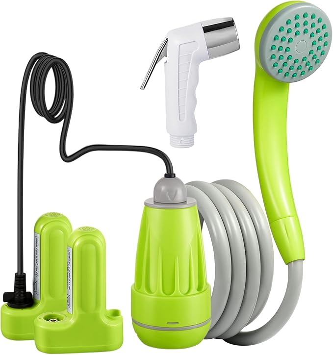 - RECHARGEABLE PORTABLE SHOWER: Come with TWO detachable USB rechargeable batteries separated from the pump. External on/off switch feature, which is an improvement over previous design.No need to immerse the batteries into water,which can protect and enhance the batteries life.