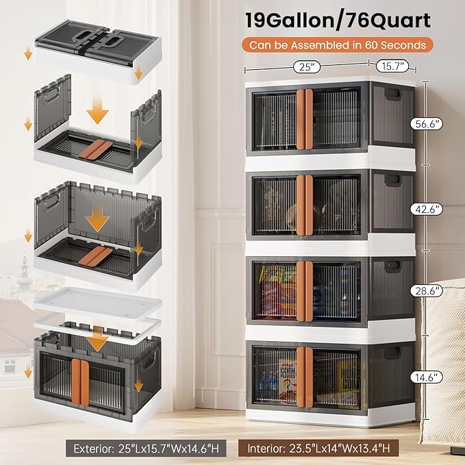 19Gal Collapsible Storage Bins with Lids & Wheels - 1 Pack Stackable with Doors, Heavy-Duty Plastic Containers for Home/Office, White
