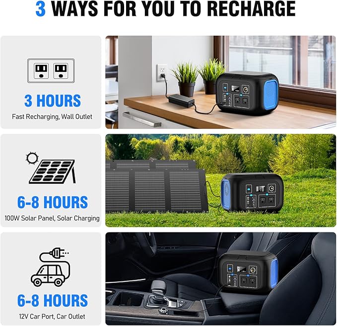- 【3 Hours Fast Charging Power Generator】It takes only 3 hours to fully charge the battery bank through the AC wall charger. You can also recharge it with car outlet in your car or solar panel (DC 13-25V, suggest 100W+, solar panel NOT included), it becomes a solar generator to provide eco-friendly green power. It is an ideal battery backup for camping, climbing, cycling, traveling, RV trip, home use, outdoor activity, deals with power outages, and hurricane emergency.