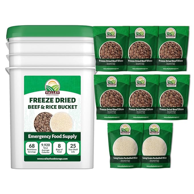 68 Serving Freeze Dried Beef & Rice Bucket | Premium Emergency Food Supply, Contains 924 g Protein | Non-GMO Survival Food 25 Year Shelf Life | Prepared Foods Survival Kits from Valley Food Storage