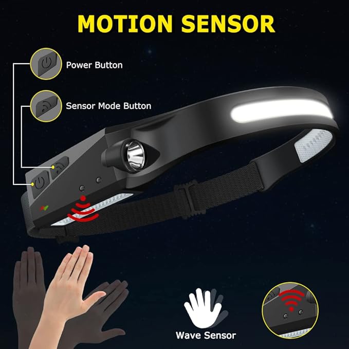 - Motion Sensing & 5 Light Modes: Head lamps have 5 working modes, including COB high mode, COB low mode, LED high mode, LED low mode, and strobe mode to meet all scenarios. The head lamp has sensitive intelligent sensor, so that you can press the sensor mode button and turn the head flashlight on or off with a wave of your hand.