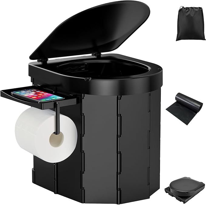 Portable Camping Toilet, Foldable Toilet for Adults with Detachable Phone Shelf and Toilet Paper Holder, Waterproof Porta Potty with Lid for Camping, Hiking, RV Travel, Road Trips