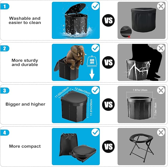 - 【Sturdy and Comfortable】Our portable toilet for camping is more comfortable with a higher and wider seat compared with those round ones in the market. Made of premium ABS plastic, it is washable and sturdy to bear up to 400lbs, suitable for both adults and kids.