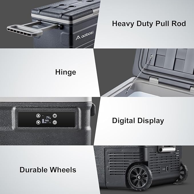 - 【Handle & Wheels Design】12v car refrigerator has heavy-duty handle and wheel is easier to move and portable.This 12 volt camping fridge with friendly design is very convenient for your daily use.BODEGACOOLER car refrigerator compatible with various power sources to meet your life needs.