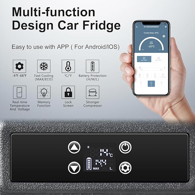 - 【ECO/MAX Modes and APP Control】portable refrigerator has two modes options.The fast cooling(MAX) mode only 15 mins cooling down from 68℉ to 32℉.The energy saving(ECO) mode is normal cooling speed that can reduce power consumption.Besides,You can use APP to control this car fridge from distance or in car.Intelligent temperature control function to meet the required temperature of various ingredients.