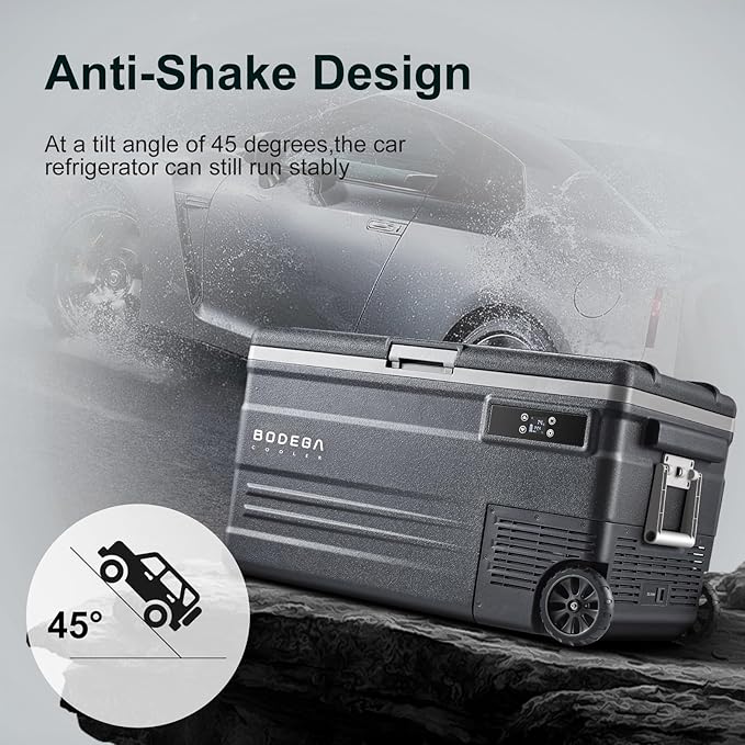 - 【Anti-Shake Design】This 12v camping fridge equipped with a multi-functional non-slip base,the lateral displacement is greatly reduced.When your car,RV or truck is climbing at an inclination angle of 45 degrees,BODEGA 75l car fridge can still run stably. This car fridge can be used at home or in the vehicles.
