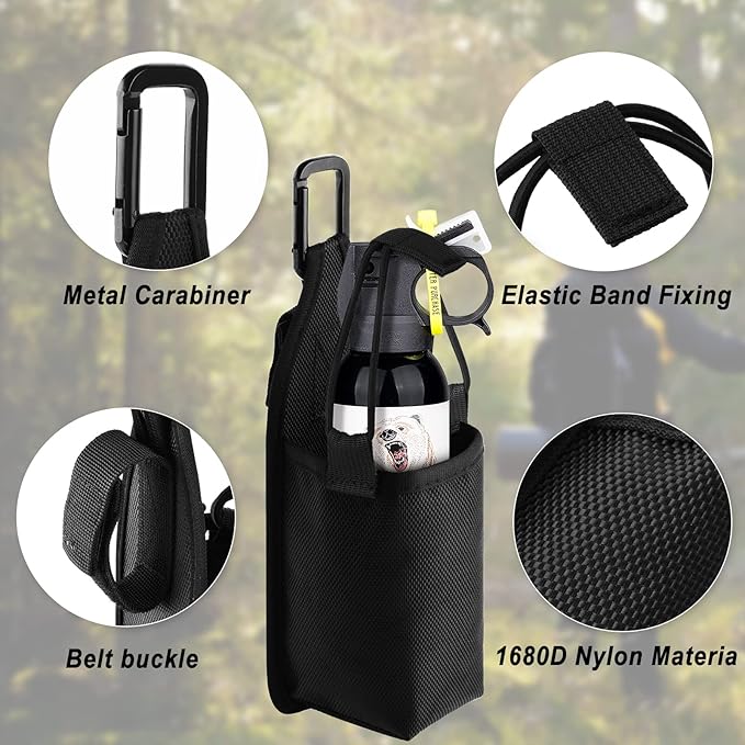 - Quick Access: Bear spray holster opening is secured by strong elastic to prevent loss. Deterrent canister slides quickly from holster sleeve with no closures to undo.