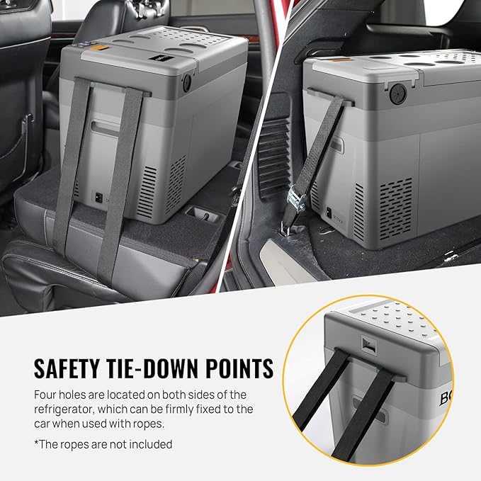 - 4 Safety Tie-down Points: Through four holes located on both sides of the CRPRO refrigerator, it can be fastened securely with ropes in your car truck, seat, and other slippery surfaces. Do not worry about the refrigerator moving when driving the car