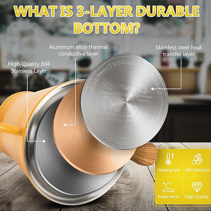 - Heat resistant handle ensures safety during pouring: Ergonomic resin handle with wood texture prevents slipping and burns; Lift and pour comfortably with bare hands for steady control; Included heat-insulating base protects the tabletop from burns