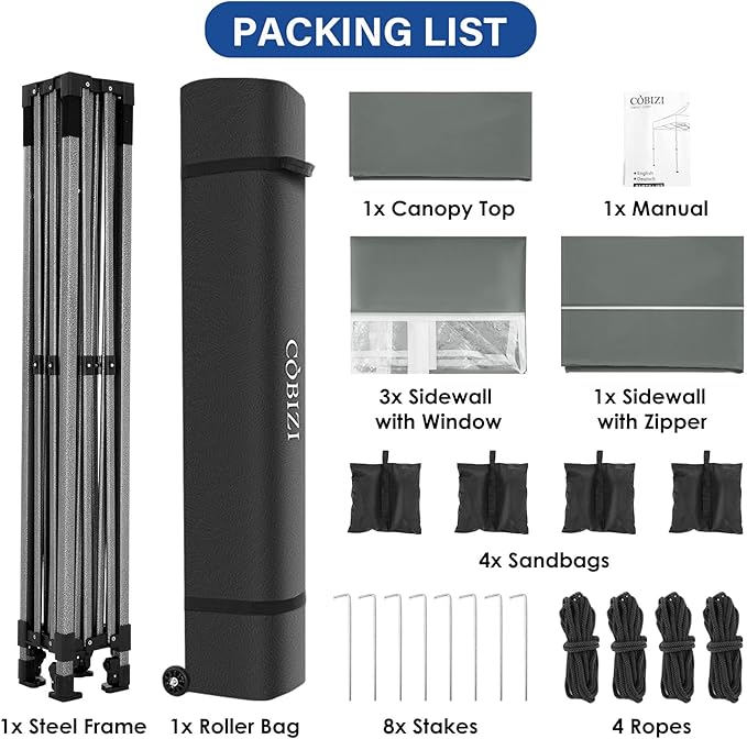 - 【Packing List】1x 10x10 Commercial Pop-up Canopy Frame, 1x 10x10 Canopy Top Cover, 4x PU coated Panels (3x SideWalls with Window and 1x SideWalls with Zipper), 4x 420D Oxford cloth PVC coated Sandbags, 8x Ground Pegs, 4x Wind Ropes, 1x Wheeled Bag, 1x Manual. We provide you with the best service, if you have any questions and doubts, please feel free to contact us. Choosing us will be a right decision