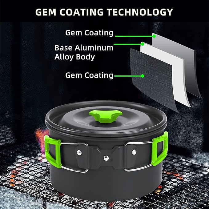 - DURABLE AND SAFE MATERIAL - This camping cookware set is made of food-grade aluminum alloy and includes a camping pot, a camping pan, a camping kettle and a portable nylon set bag. The camping cookware can be nested together, lightweight, non-toxic, fast heat conduction, wear-resistant and corrosion-resistant.