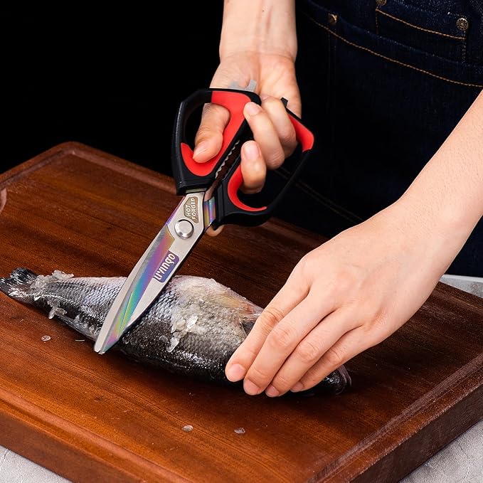 - Durable Sharp Kitchen Scissors: Made of premium heavy duty high carbon food grade stainless steel, more durable and higher hardness not easy to break. After precise grinding, the kitchen scissors are sharper than normal. Titanium coated treatment can better prevent scissors rust.