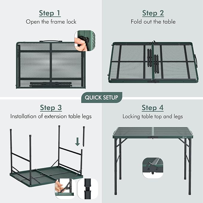 - Easy Set-Up: Designed for easy assembly and disassembly, this portable camping table can be set up in just a few minutes, allowing you to spend more time enjoying your camping experience