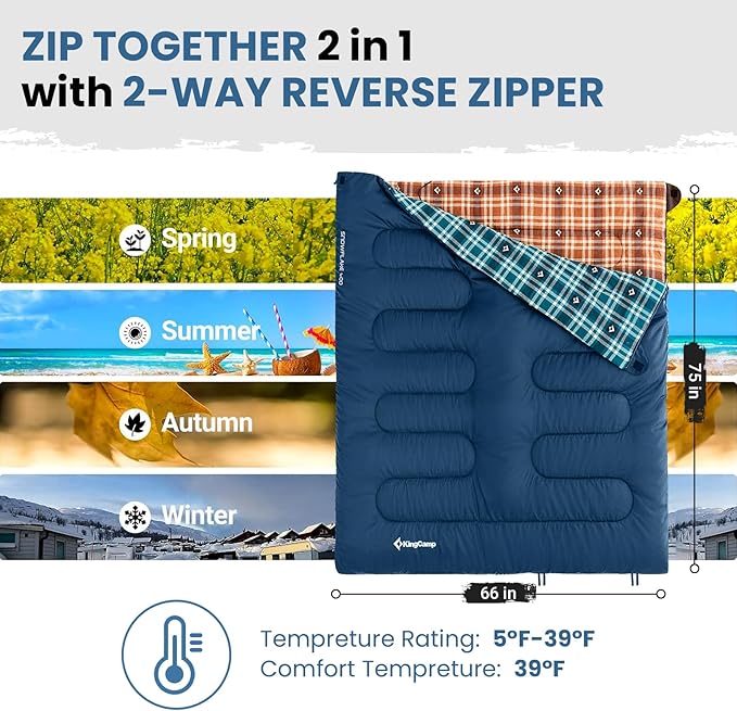 - MULTIFUNCTIONAL DESIGN-More Than Just a Sleeping Bag: This versatile sleeping bag offers more than just a place to sleep! The 2-way zippers allow you to zip two sleeping bags together for couples or family camping. Unzip the bottom for extra ventilation to cool your feet on warmer nights. Not only can it be used as a sleeping bag, but it can also be transformed into a blanket or picnic mat for family trips. Plus, it's machine washable, making cleaning a breeze for frequent use.