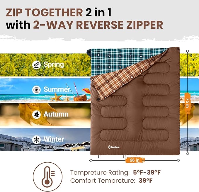 - MULTIFUNCTIONAL DESIGN-More Than Just a Sleeping Bag: This versatile sleeping bag offers more than just a place to sleep! The 2-way zippers allow you to zip two sleeping bags together for couples or family camping. Unzip the bottom for extra ventilation to cool your feet on warmer nights. Not only can it be used as a sleeping bag, but it can also be transformed into a blanket or picnic mat for family trips. Plus, it's machine washable, making cleaning a breeze for frequent use.