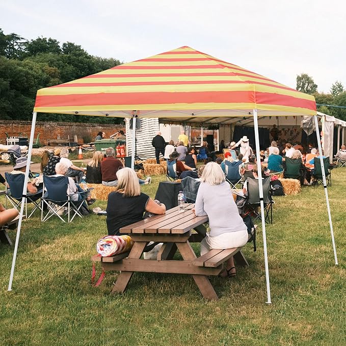 EAGLE PEAK 10x10 Slant Leg Pop-up Canopy Tent Easy One Person Setup Instant Outdoor Beach Canopy Folding Portable Sports Shelter 10x10 Base 8x8 Top (Orange Yellow Stripe)