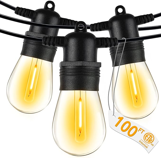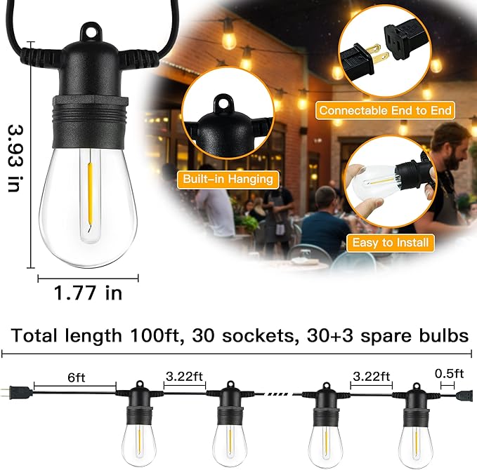 - 【High-Quality Outdoor Decorations】100FT LED outdoor string lights provide 30 E12 sockets and 33 bulbs (3 spare wicks), extra long design for any occasion, such as patio, garden, or porch. the upgraded 2700K string lights can emit a softer light and create a comfortable and cozy atmosphere, allowing you and your family/friends to enjoy a relaxing time