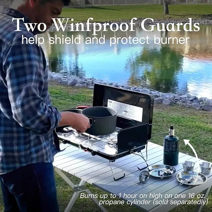 - POWERFUL CAMPING STOVE: Get cooking quickly with our powerful 2-in-1 camping grill stove, featuring 2 burners with 2 x 10000 BTU of cooking power, improved knob rotation for ultimate simmer control, and 2 wind guards to shield and protect burners from wind.