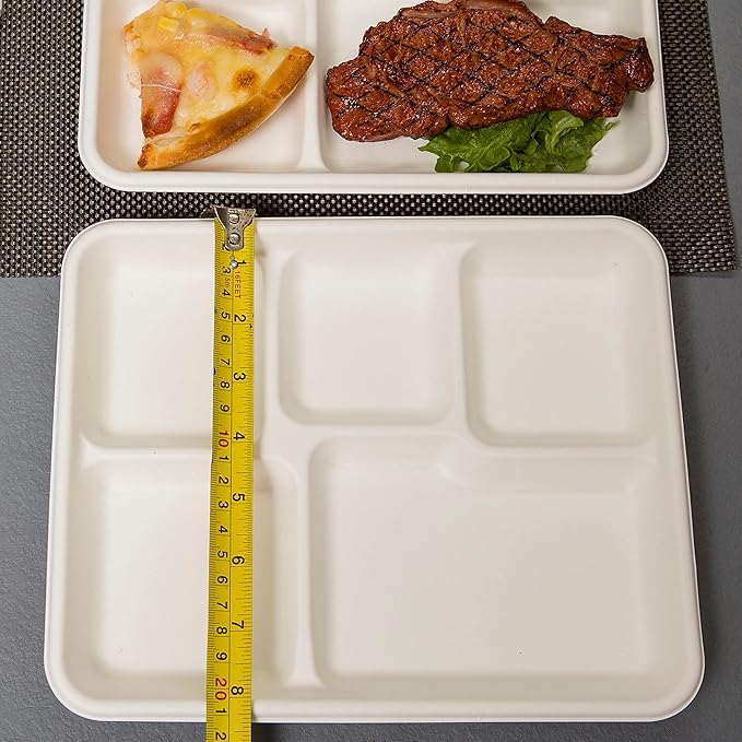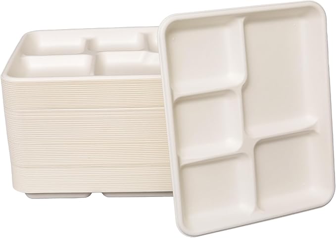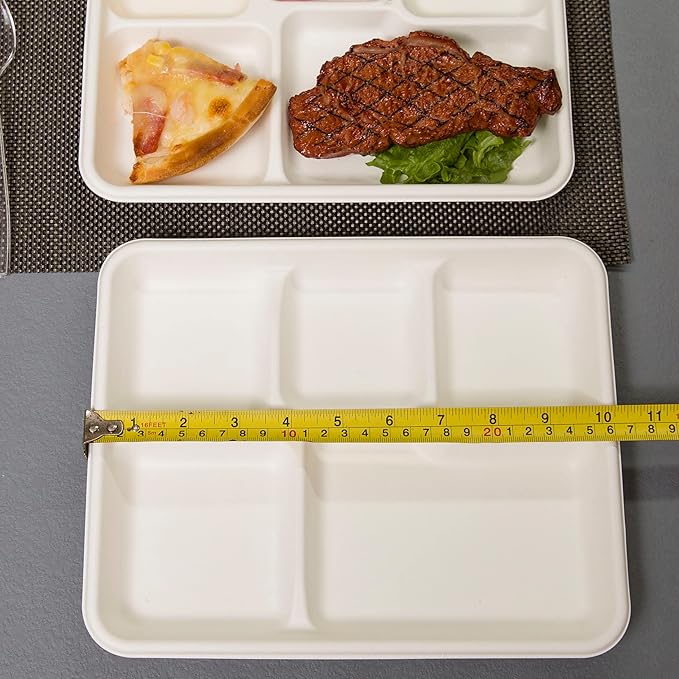 Small and Shallow 10.25 * 8.25inch 5 Compartment Plates 125pack, Disposable 5 Section eco friendly Sugarcane Divided Plates,School Lunch Tray And Disposable Plates With Compartment