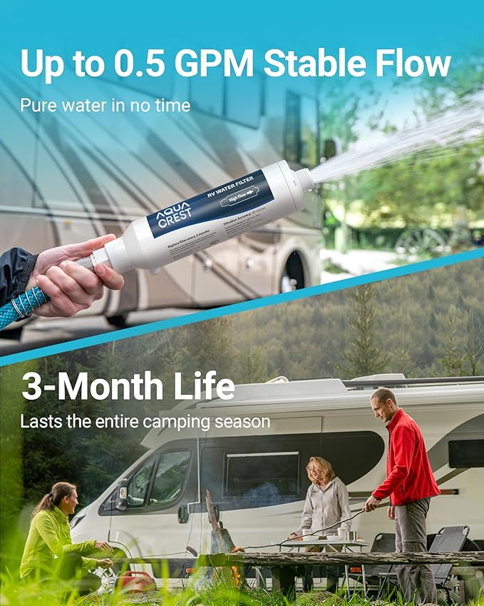 - Premium Hose Protector: With the premium hose protector, AQUA CREST water filter for RV can be flexibly rotated 360 degrees, the hose is equipped with anti-rust copper head at both ends, and the bottom end is equipped with a silicone gasket, so you don't have to worry about breakage and water leakage. This filter has a flow rate of 0.5 gpm.