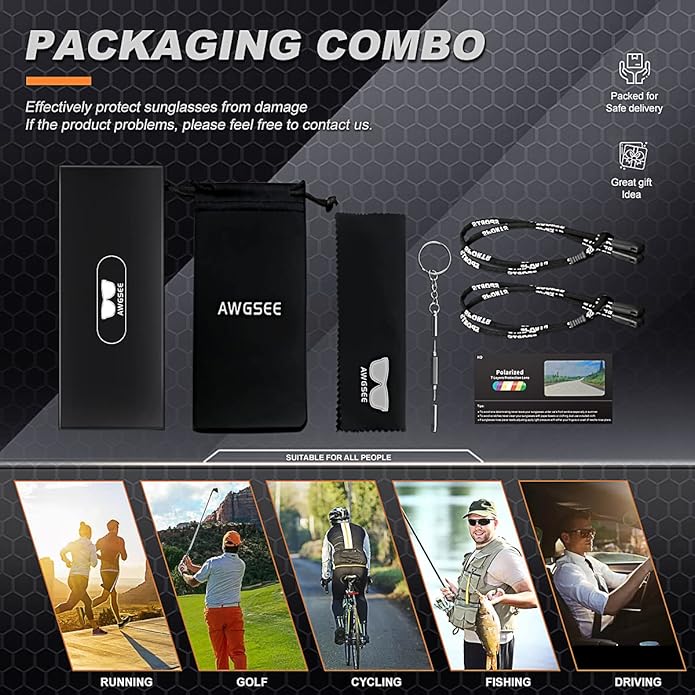 - 100% UV PROTECTION & POLARIZED SUNGLASSES - Soak up the sun and enjoy life. When you are engaged in outdoor activities, strong ultraviolet rays can harm our eyes. Do you ignore the health of your eyes? AWGSEE mens sunglasses polarized uv protection can protect your eyes from harmful ultraviolet rays, reduce glare and provide additional clarity, and can ease eye strain from long hours in the sun.