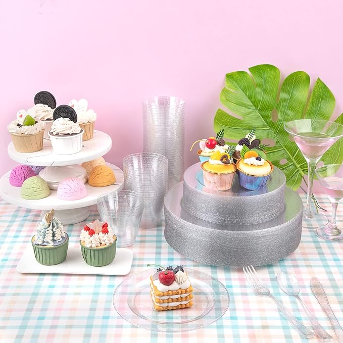 - HIGH QUALITY & DURABLE: Our Mother day gifts sturdy silver plastic plates are able to hold a larger volume of food, sharper silver glitter plastic knives can cut through the thickest food items with ease.