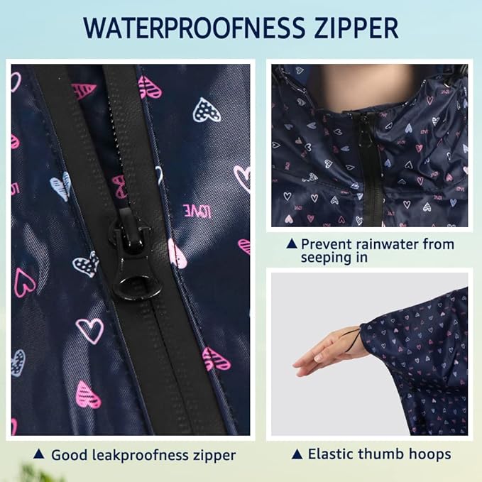 - Elastic Thumb Ring Design & Waterproof Zipper: This poncho has plenty of additional features that make it stand out. Like all Anyoo rain capes, they’re unisex. And it has elastic thumb loops for rainy bike rides that avoid the wind blowing the poncho away. Front upgraded waterproof zip and a piece of interior cloth provide double protection