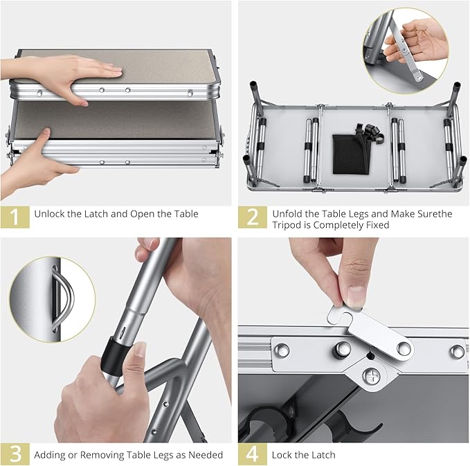 - High Quality Material, Sturdy and Durable: The entire frame of portable table is made of thicker aluminum alloy, which is very solid and durable. MDF (Medium Density Fiberboard) tabletop is smooth and easy to clean. You can easily remove stains by simply wiping with a damp paper towel