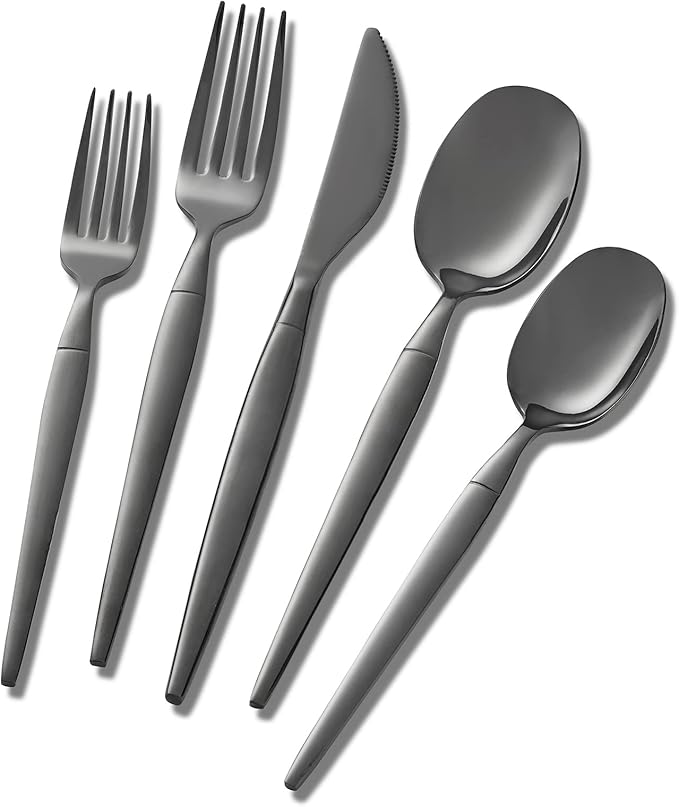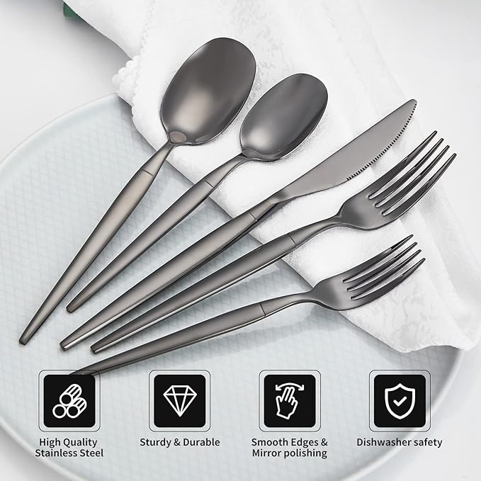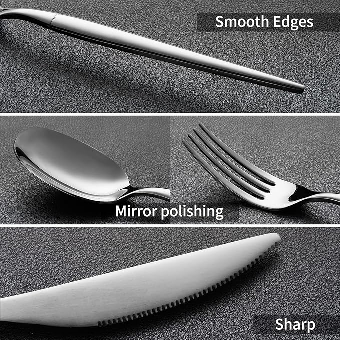 - UNIQUE DESIGN AND EXQUISITE WORKMANSHIP: This stainless steel silverware set has a perfect mirror finish with smooth edges and a unique shape design. It's perfect for family dinners and can be used with any cutlery you have. The handle design is based on the curvature of our hand grip, which is very simple and comfortable to use.
