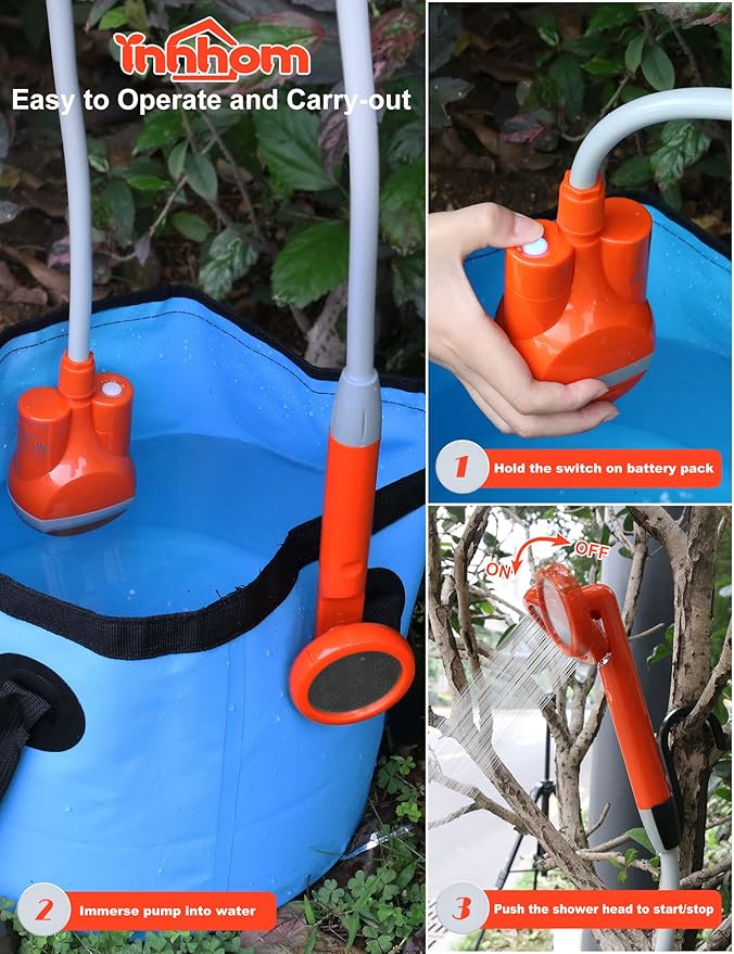 - 【Safe and Convenient Outdoor Camp Shower】innhom camp shower conforms to the safety requirements of RoHS standard, EN 55014-1, and EN55014-2. The water filter system ensures that the water is clean and protects the shower head from being clogged. The O-ring protects against water escaping from the connection of the shower hose and showerhead.