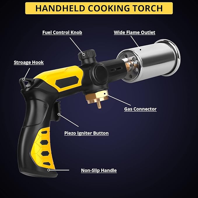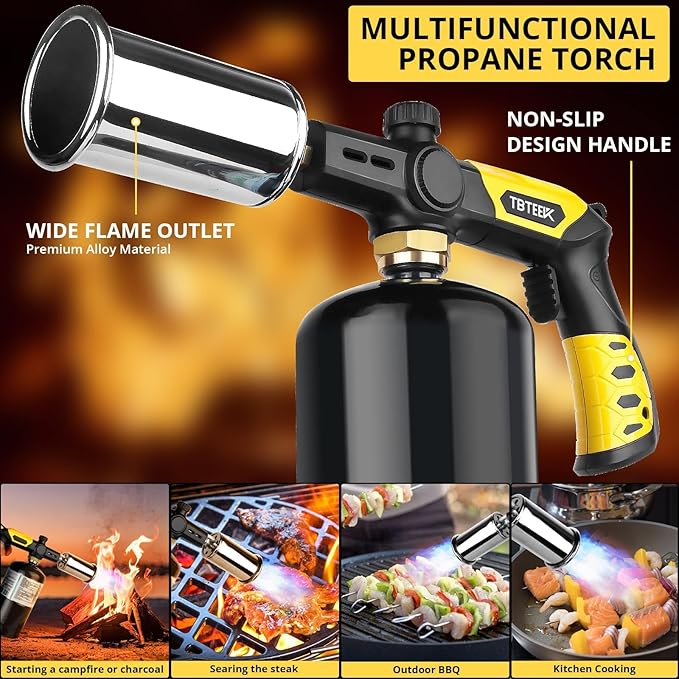 - Powerful and Safe Propane Cooking Torch: TBTEEK culinary torch lighter is designed with a really powerful ignition system which could shoot out plenty of heat and a large flame, so that it could quickly light up a large split wood or speed up searing after sous vide cooking the steaks, saving lots of your time. The long handle design and the finger guard could protect you away from the flame and avoid accidental burn.