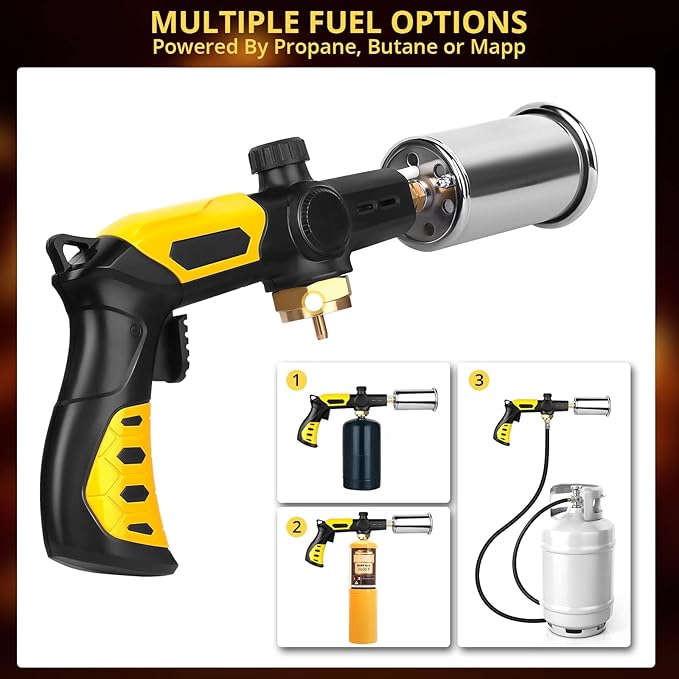- Refillable Kitchen Torch: This handheld searing torch is refillable and could work with the propane, MAPP, MAP-Pro,Coleman Propane CGA600 Canister. Also it fits most of the propane tanks. (For the safe shipping, the propane tanks are not included)