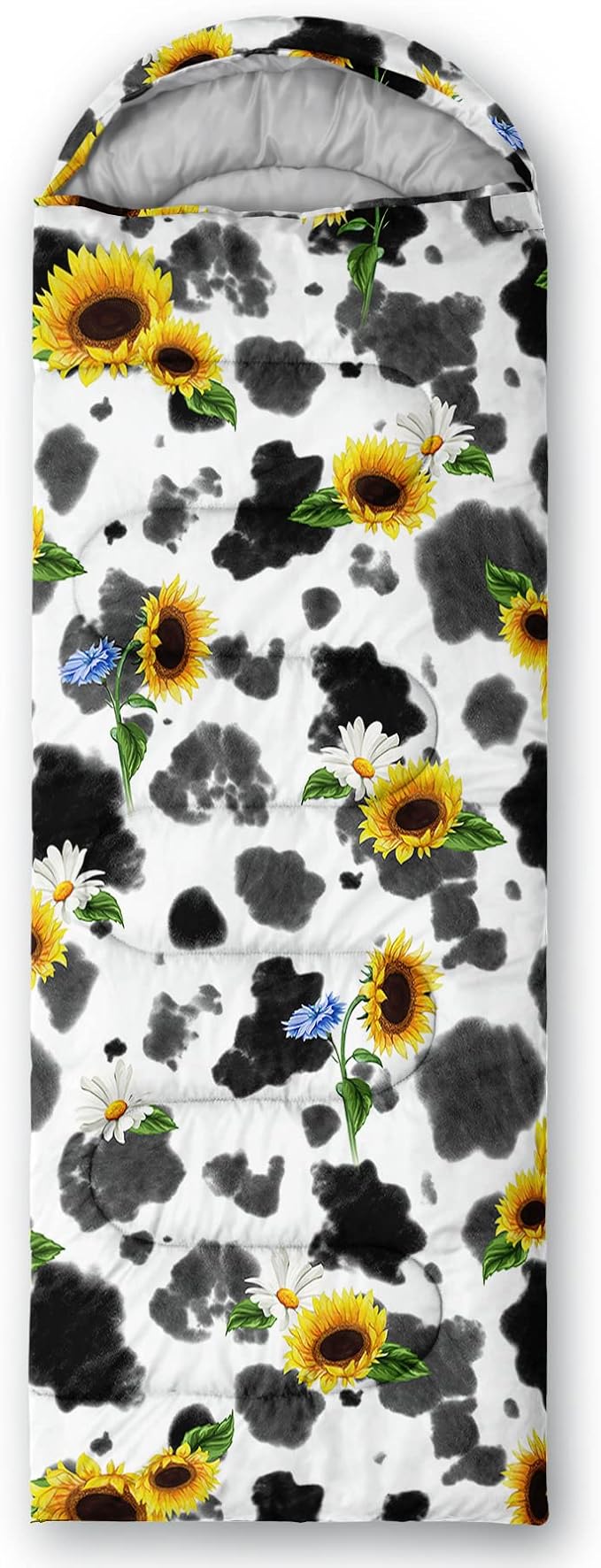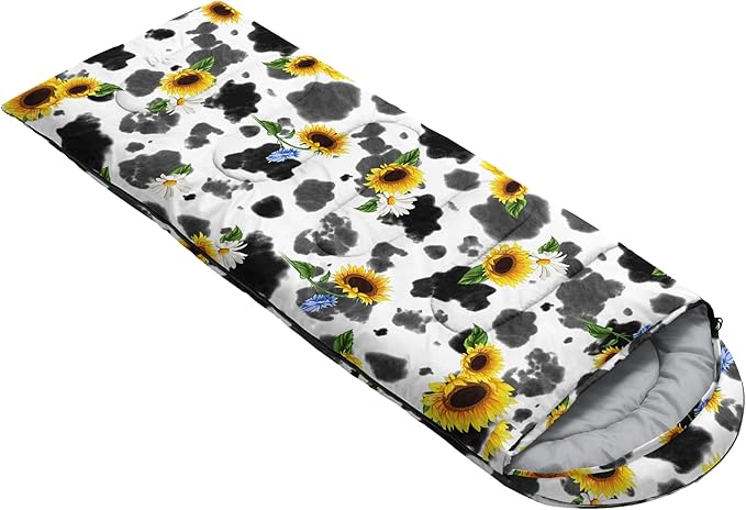 - A THOUGHT OUT DESIGN: Drawstring allows you to tighten hood and keep you warm. The idea of having a zipper at the foot to allow more warm or cool air to enter or exit the bag in different times of the season.Our Cow Pattern Sunflower sleeping bags are designed to provide much needed rest after a full day of outdoor activities.