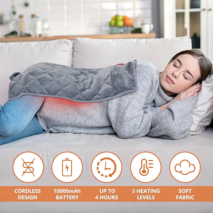 - Cordless Heating Pad with Battery: This Cordless Heating Pad comes with a 10000 mAh mobile battery, allowing you to use it anywhere, anytime, without being restricted to a location near an outlet. So you can get fatigue relief comfortably in bed, on the couch, in your office chair or anywhere! This user-friendly design ensures that you can avoid injuries due to short circuits in your home wiring, while also ensuring a very large space to move around