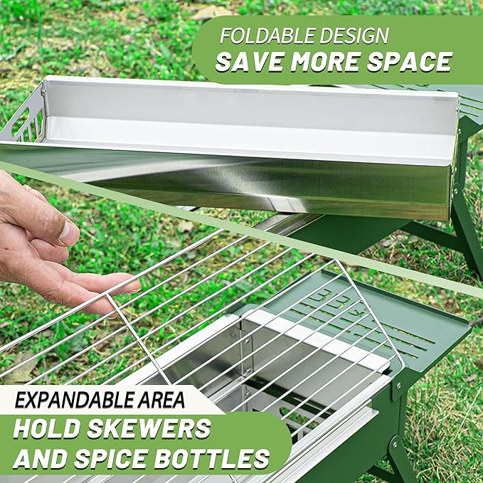 - UNIQUE DESIGN: The expanded area on both sides of the foldable barbecue grill can hold skewers and seasoning bottles freeing your hands, and the charcoal slot venting design immediately makes the charcoal glow without extra effort. In just a few minutes, you'll be serving up delicious grilled sausages and juicy steaks!