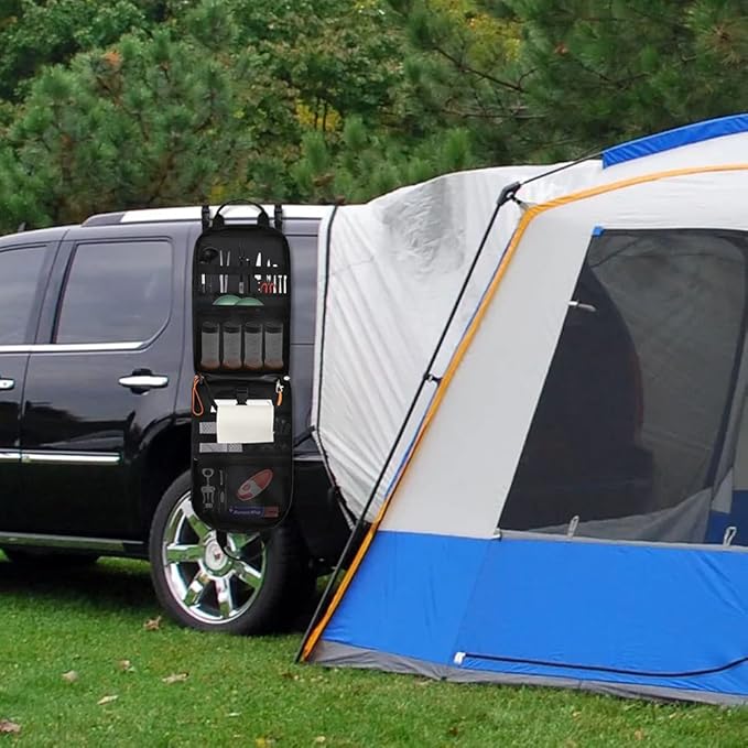 - 【High Capacity & Multifuctional Storage】4x sleeve pockets for organizing cooking utensils ,2x sleeve pockets to store plates or larger cooking utensils,1x disassemble rope to hold paper towel,2x mesh pockets with zipper to store cooking spices or tools, 1x elastic to hang cleaning cloth,1x large sleeve pocket with adjustable buckles to store cutting board. Keep all your outdoor kitchen essentials in one kit to make car camping easier.