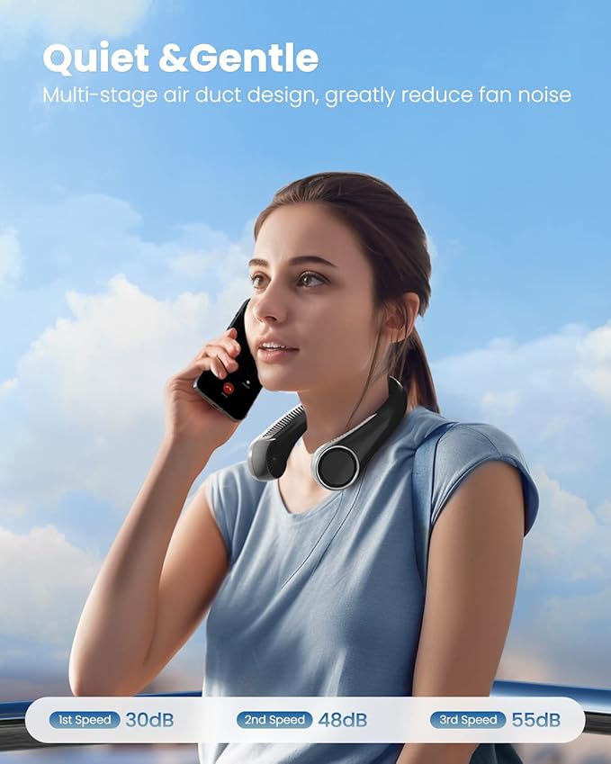 - Low Noise & Adjustable Angle: This neck cooler operates quietly from 30dB for minimal noise, letting you stay focused or relax without distraction. The adjustable angle lets you find the most comfortable position, and enjoy a perfect breeze in any situation