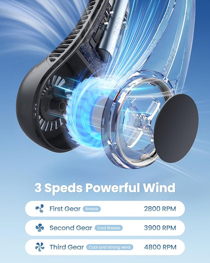 - Powerful Wind with 3 Speed Settings: This neck cooler uses turbine blades to boost airflow, delivering steady, strong wind that quickly refreshes you. You can easily adjust the speed to suit your needs—whether you want a gentle breeze or a powerful blast