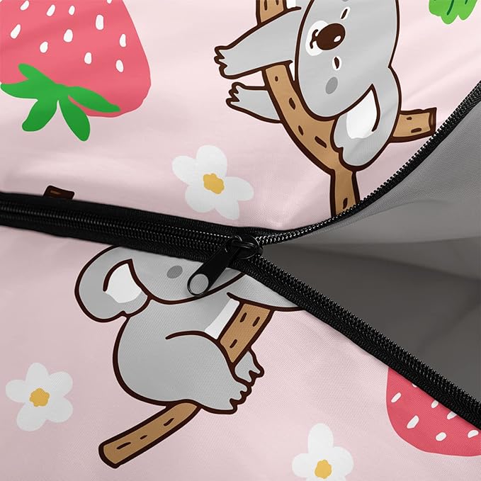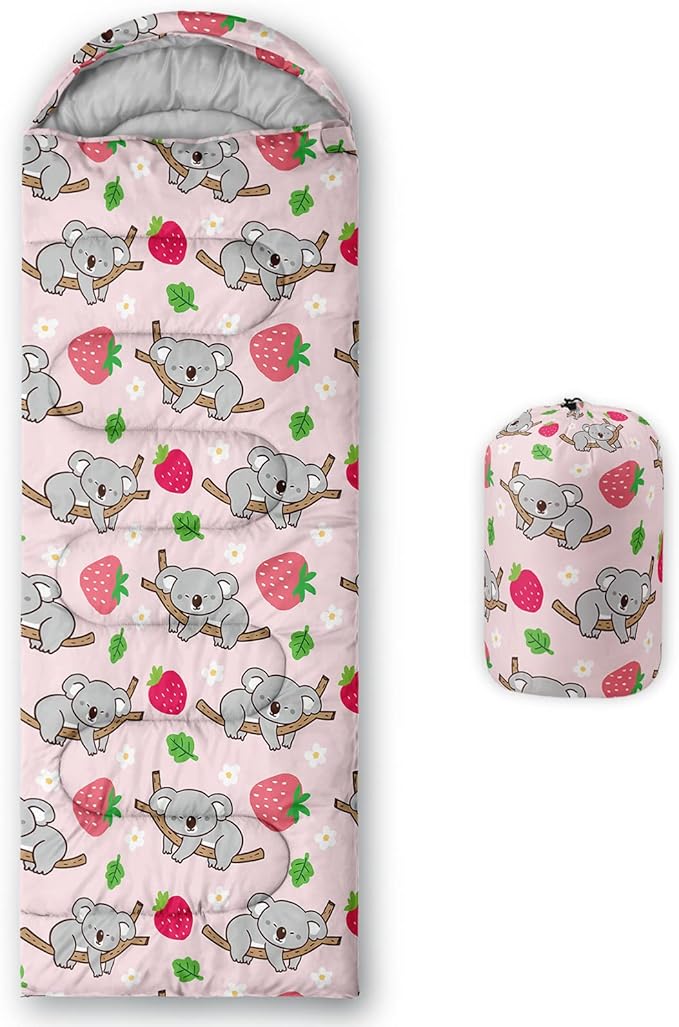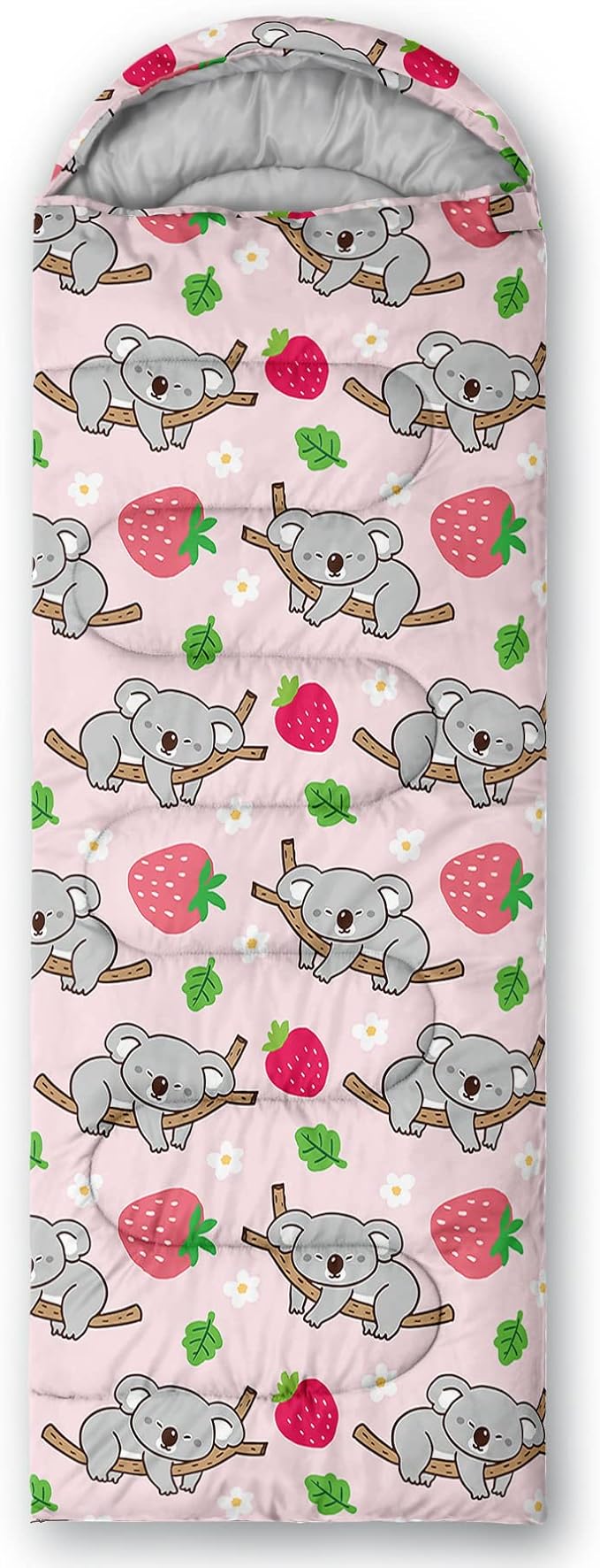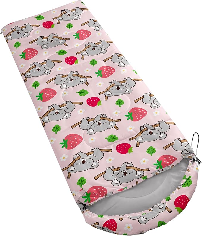- A THOUGHT OUT DESIGN: Drawstring allows you to tighten hood and keep you warm. The idea of having a zipper at the foot to allow more warm or cool air to enter or exit the bag in different times of the season.Our Cute Strawberry Koala sleeping bags are designed to provide much needed rest after a full day of outdoor activities.