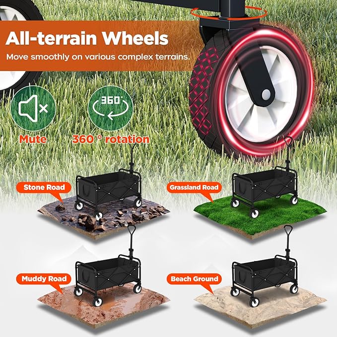 - 360°Universal Wheels: This collapsible wagon utility cart is equipped with four 6.5" diameter all-terrain wheels, including two front wheels that can rotate 360 degrees. Our folding collapsible wagon can roll on different ground, from cement to wood floor and from stone road to sand.