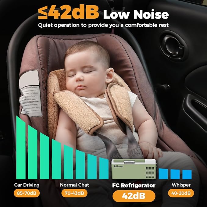 - Compact And Quiet: Setpower FC15 12 volt electric cooler has a compact capacity of 15.8 quart (15 Liter),can fit 20 cans 335ml Cola. This camping portable pefrigerator can serve you and your family enough food for 4-5 days trips. Due to its prefect mini size,you can place this portable fridge freezer anywhere ,money and space-saving. The noise test of this car portable fridge is below 42db to achieve silent operation, will not disturb your rest