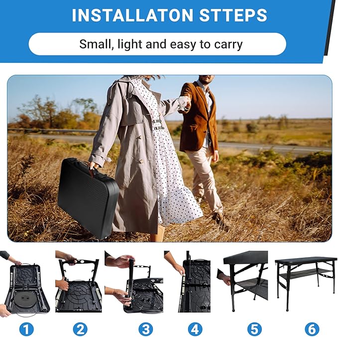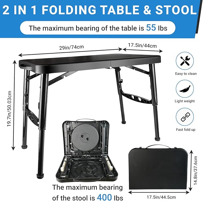 - 👍【UNIQUE DESIGN & LIGHTWEIGHT】 The one-piece portable folding table and collapsible stool is designed a pair of handle for carrying easily, like a briefcase. The total weight is only 6.6lbs, and the folding table and stool weigh 4.4lbs and 2.2lbs respectively. Even more interesting, the stool is hidden in the camping table, when you open the table, can easily take the collapsible stool out.