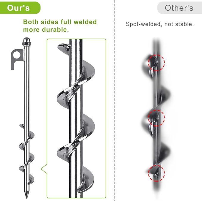 - 【Stable & Reliable】The 5-inch fully welded spiral anchors easily penetrate hard or rocky soil, providing a firm hold for your tents, trampolines, and other outdoor setups, even in high winds
